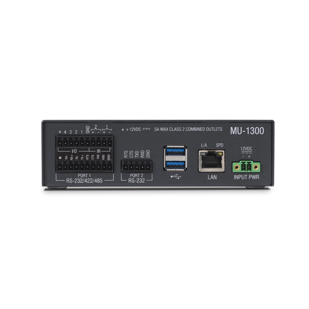 The MU-1300 is a compact device that requires a one-third width rack space and includes 2 serial ports, 2 IR ports, and 4